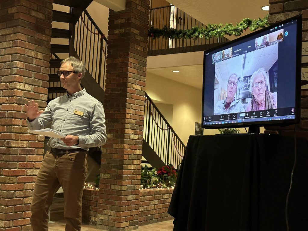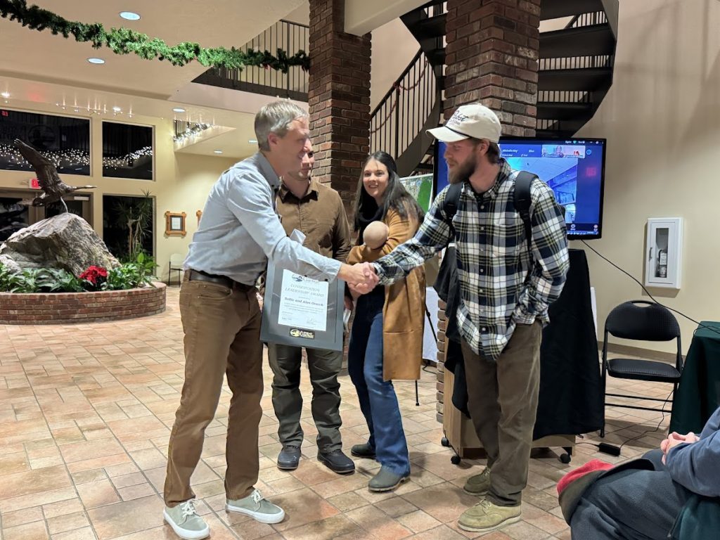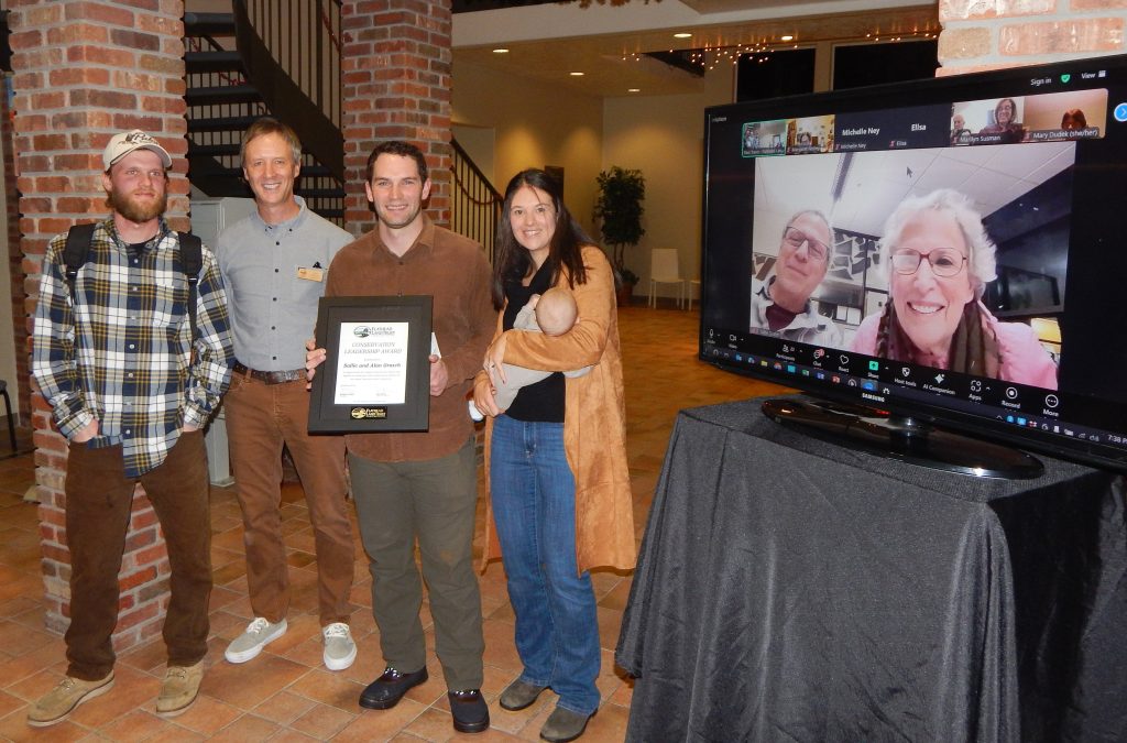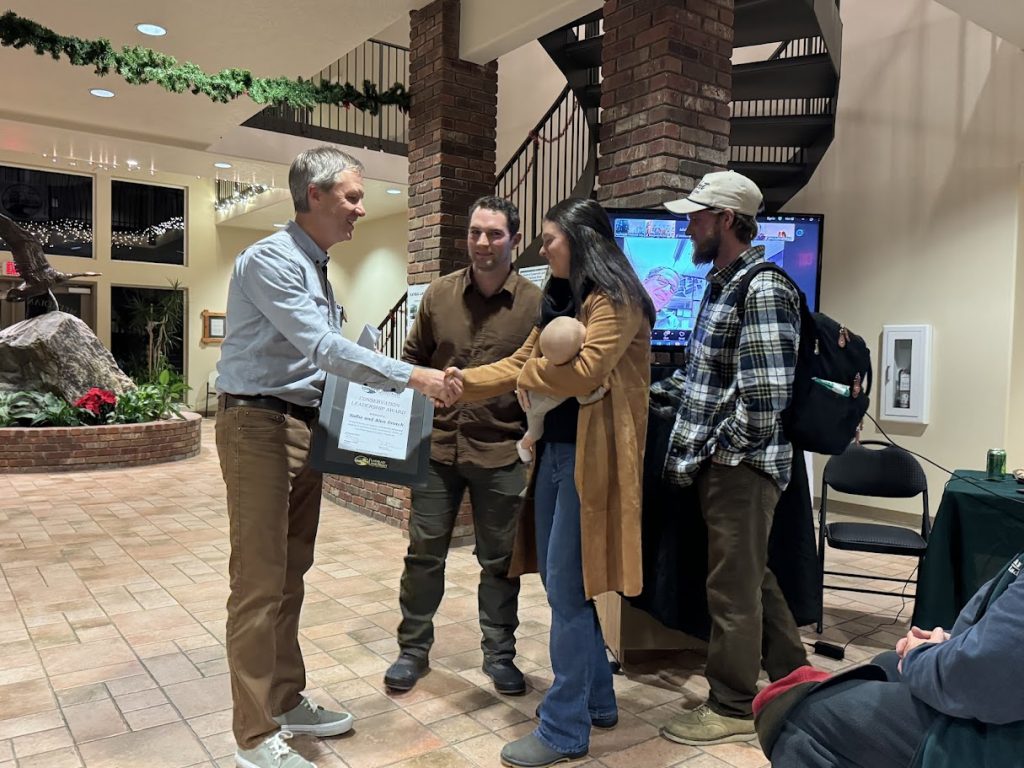 The Gratch family was presented with the award at our Member and Partner Year-end Celebration on December 11, 2025. Sallie Zoomed into the event from her home in Evanston to say a few words. “Alan would be thrilled. I’m sure he is with us tonight.” She was delighted that her grandsons, Simon and Anton, along with Simon’s wife, Madison, and two-week-old son, Cooper, traveled from the Bozeman area to accept the award on Alan and Sallie’s behalf. “It makes sense to me that they accept the award, because the land is not about two 90-year-old people, it’s about our grandchildren, and they love it.”